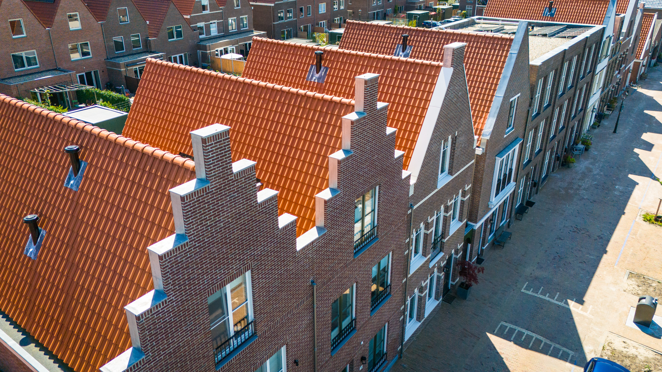 Nu, ongeveer een jaar na de oplevering, kunnen we met tevredenheid melden dat de daken er schitterend bij liggen. Zeker met dit prachtige weer komt de levendigheid van het project volledig tot zijn recht. De mix aan woningen, van herenhuizen tot appartementen, in combinatie met het omringende water en de volwassen bomenrij aan de zuidzijde, zorgen voor een prachtige nieuwbouwwijk.